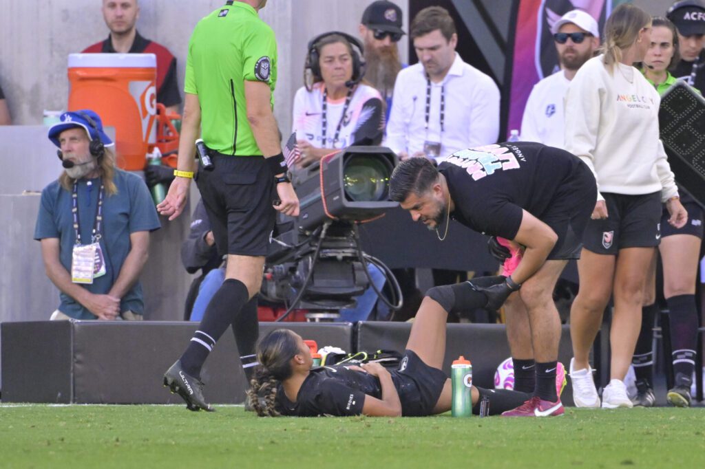 The 18-year-old rookie was stretching out her right leg with help from an Angel City trainer late in the match. The trainer handed her a HotShot, which Thompson drank and then immediately regretted.