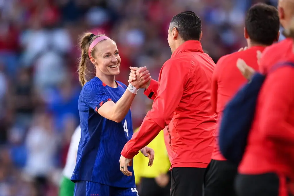 Becky Sauerbrunn shakes hands with former USWNT head coach Vlatko Andonovski. (Stephen McCarthy/Sportsfile via Getty Images)