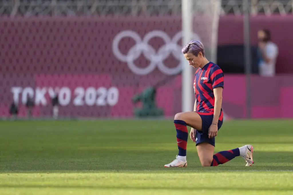 Megan Rapinoe takes a knee before the bronze-medal match between the USWNT and Australia at the Tokyo Olympics in 2021. (Brad Smith/ISI Photos/Getty Images)