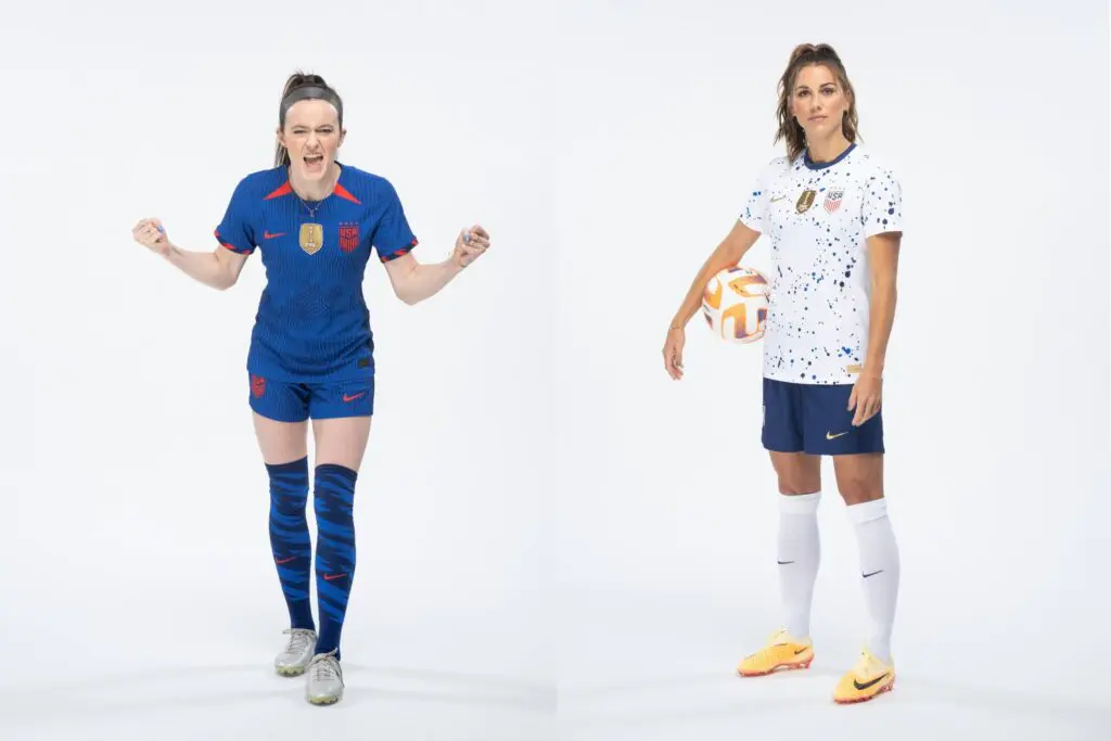 The USWNT home kit will be anchored by a white jersey with scattered blue dots, similar to a paint splatter pattern. USWNT players “wanted an unexpected take on their tradition of wearing white at home,” Nike said in a release alongside the kit unveiling.