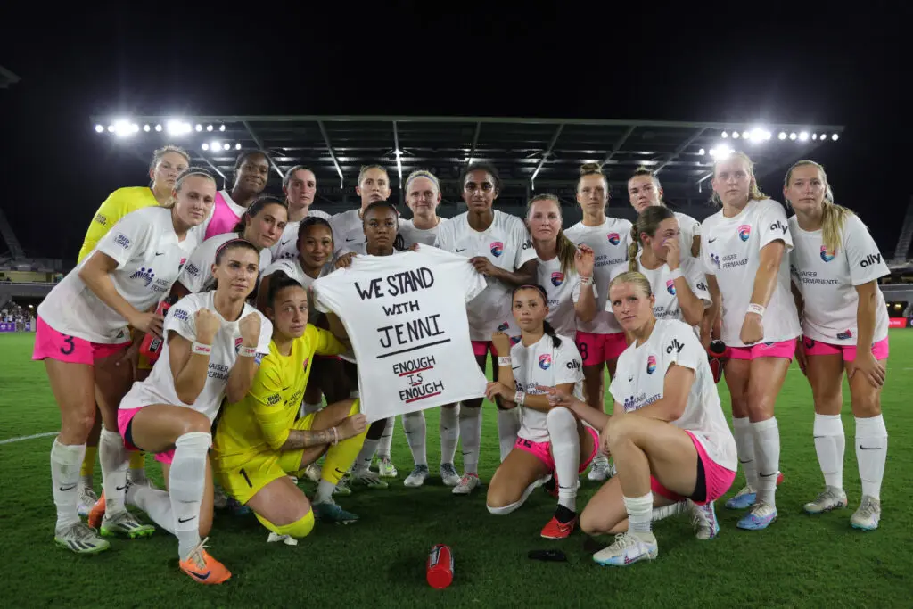 After the game, Wave players held up a white T-shirt that read: “We stand with Jenni.”