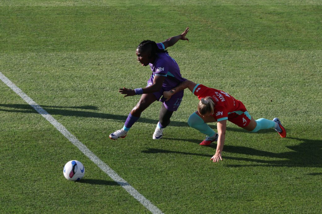 Kansas City Current defender Hailie Mace challenges Orlando Pride striker Barbra Banda during a 2025 NWSL match.