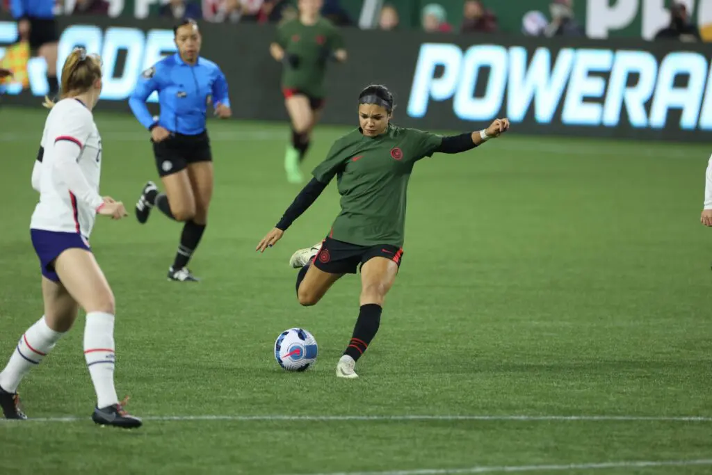 The Thorns forward scored an impressive hat trick against the USWNT U23 squad on Tuesday in the second match of the Portland Invitational, leading her side to a 3-0 victory.