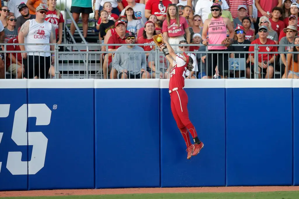 But Oklahoma All-American Jayda Coleman wasn’t going to let them get any bigger lead than that. Texas freshman Courtney Day attempted to send a ball flying over the fence, but Coleman made the grab as it was inches away from exiting the field to prevent a home run.