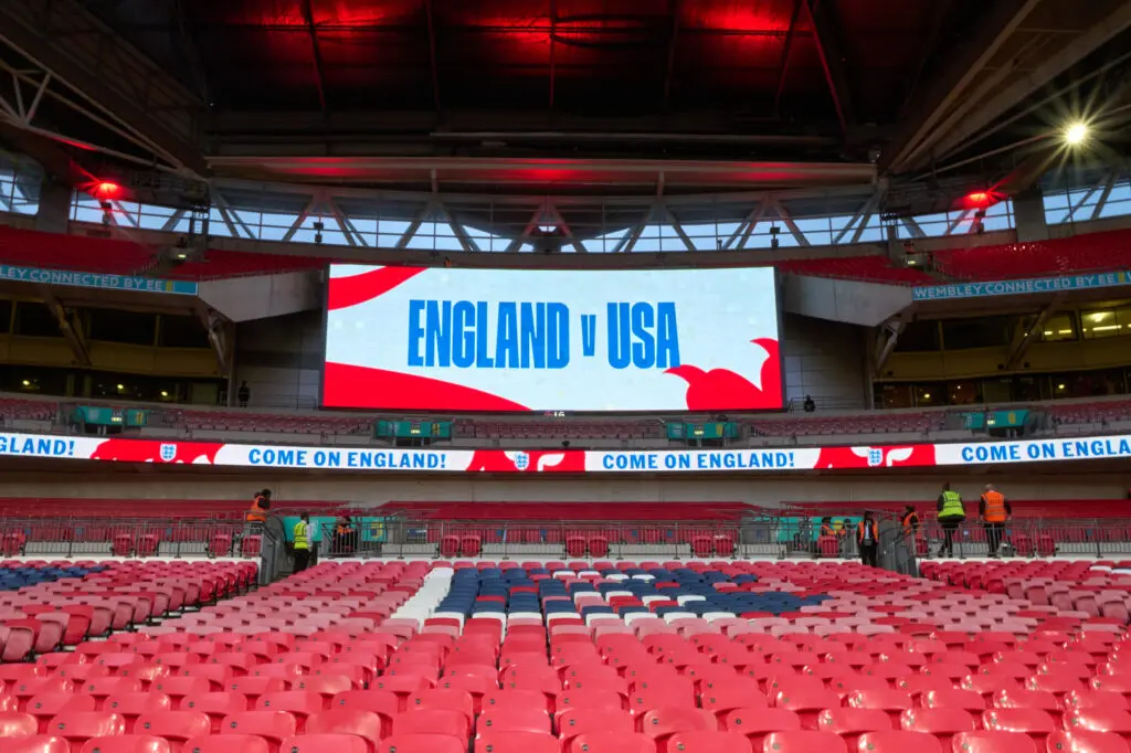A sign at Wembley Stadium reads 'England v USA' prior to the pair's 2022 friendly.