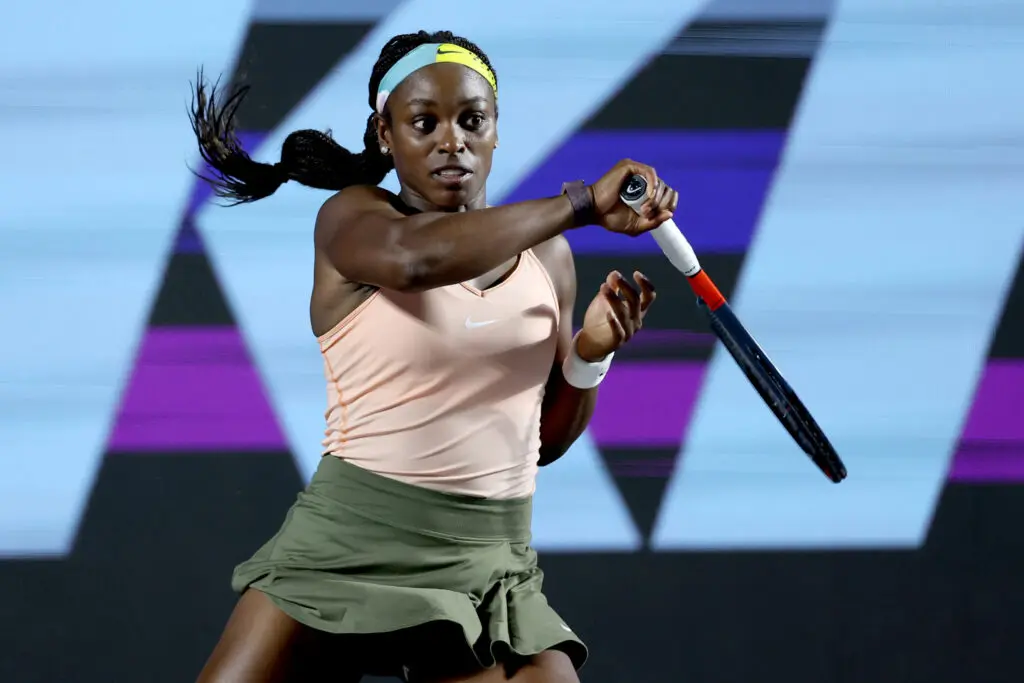 ZAPOPAN, MEXICO – OCTOBER 19: Sloane Stephens of the United States returns a shot to Belinda Bencic of Switzerland on day three of WTA Guadalajara Open Akron 2022, part of the Hologic WTA Tour, at Centro Panamericano de Tenis on October 19, 2022 in Zapopan, Mexico. (Photo by Matthew Stockman/Getty Images)